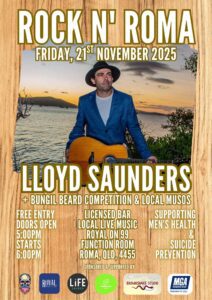 Roma’s very own Lloyd Saunders will be hitting the stage as the headline act, joined by a lineup of incredible local musical talent. Get ready for an unforgettable night of live music, great vibes, and community spirit right here in Roma!