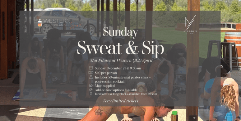 Join us for Roma’s favourite Pilates event — Sunday Sip & Sweat — a 50-minute Mat Pilates session on the distillery verandah at Western QLD Spirit Distillery, followed by a refreshing post-session cocktail. What’s included in your $40 ticket: 50-minute Mat …