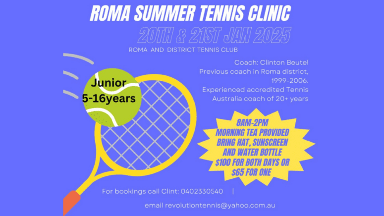Get into the summer of tennis with the Roma Summer Tennis Clinic! Clinton Beutel, experienced and accredited tennis coach, will be running a junior clinic on Monday 20 and Tuesday 21 January. For ages 5 – 16 years. All levels of …