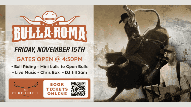 BULLAROMA is back…. Friday 15th November gates open from 4:30pm Bull Riding: Open Bulls, Novice, Junior, U15 Mini Bulls, U7-12 Mini Bulls Live Music with Chris Bax Entertainment DJ till 2am Food Vans Bars Family Entertainment Buy tickets online and save….
