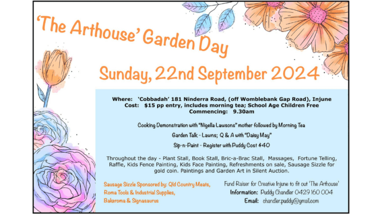 Come along to ‘The Arthouse’ Garden Day, raising funds for Creative Injune to fit out ‘The Arthouse’. Cooking demonstration followed by morning tea Garden talk – Lawns, Q&A with Daisy May Sip-n-Paint – register with Puddy, $40pp Throughout the day there …