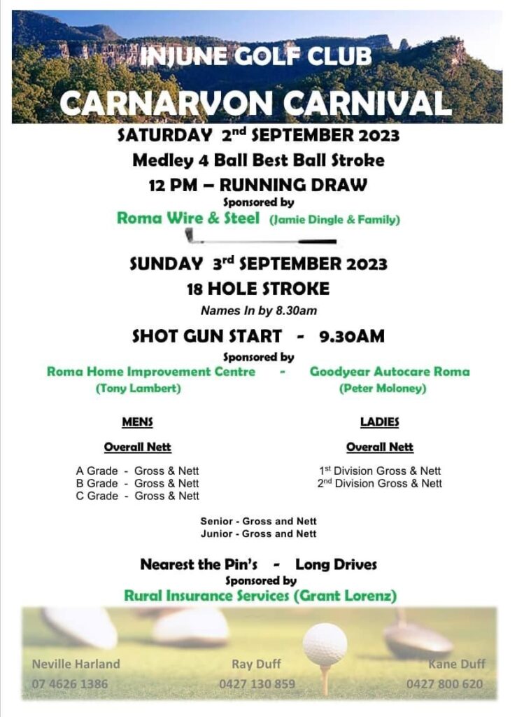 Enjoy a weekend of golfing action at the Injune Golf Course for the Carnarvon Carnival! Saturday will be a Medley 4 Ball Best Ball Stroke, names in by 11.00am, starting at 12pm. Sunday will be 18 Hole Stroke, names must be …