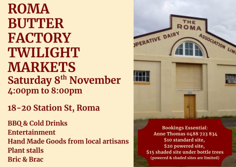 The Roma Butter Factory Twilight Markets are on again! A great evening with BBQ, cold drinks, entertainment, stalls, and more.